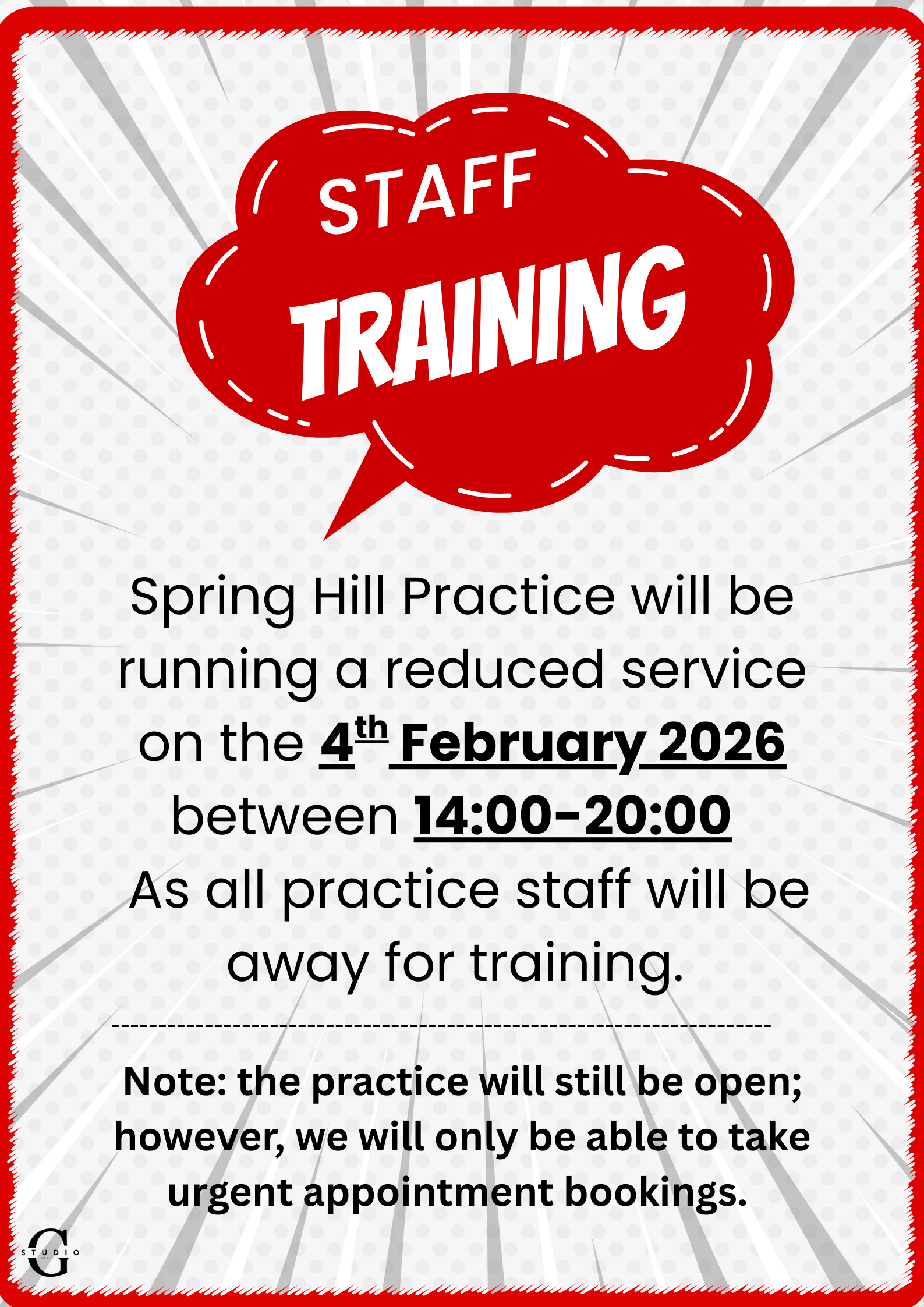 Spring Hill Practice will be running a reduced service on the 4TH FEBRUARY 2026 between 14:00-20:00 as all practice staff will be away for training.
